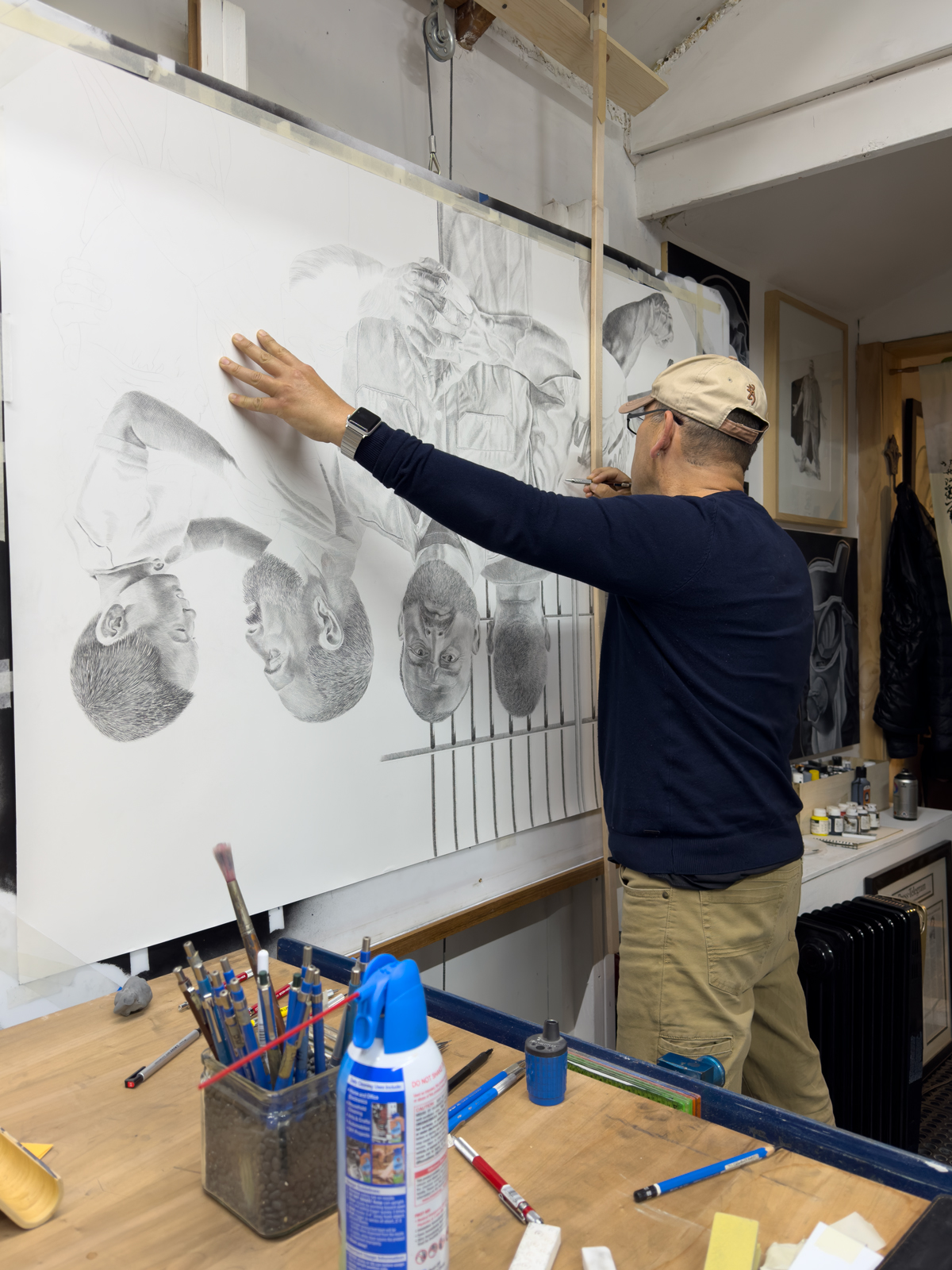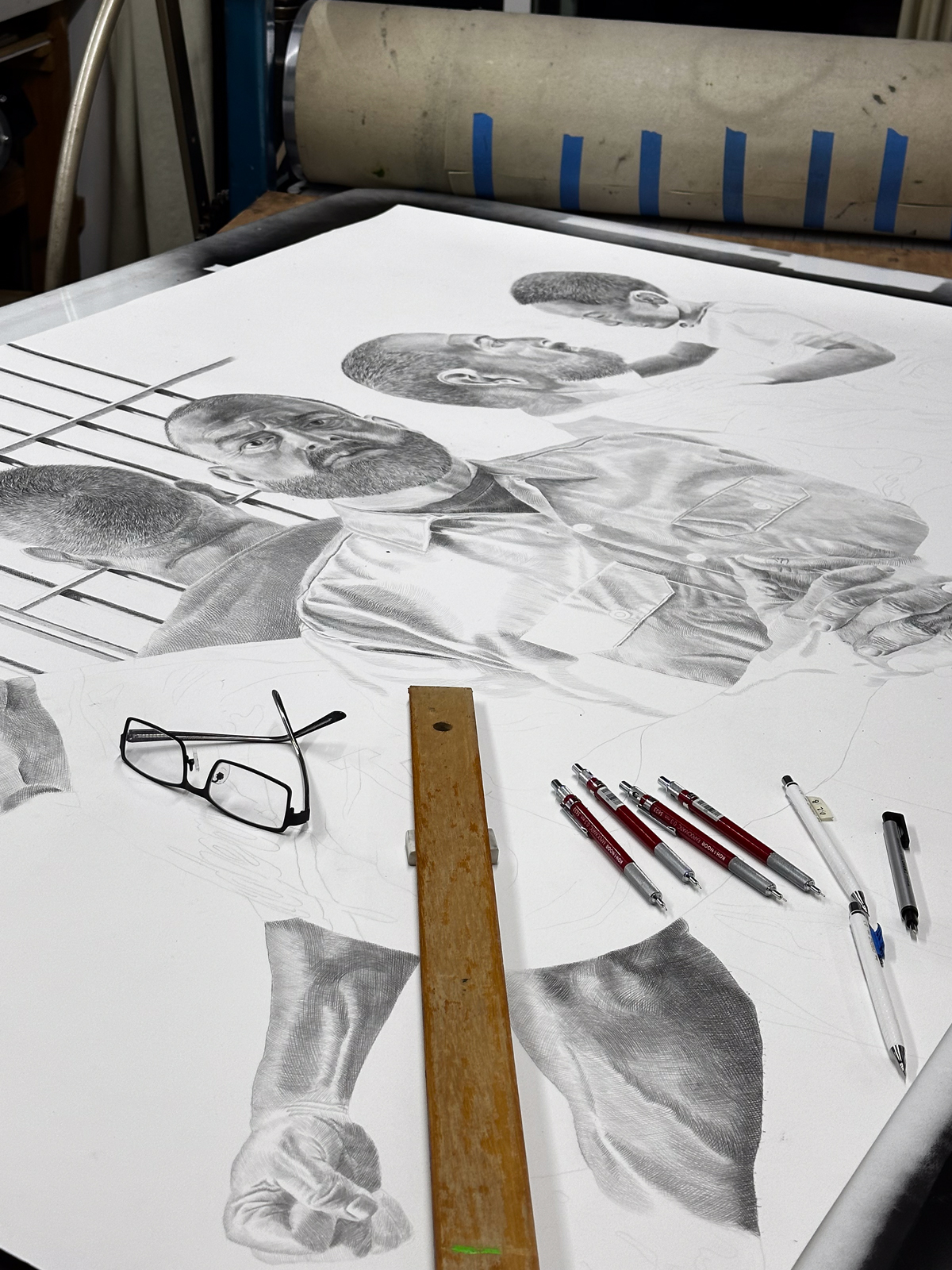 The work was executed using Alejandre’s signature crosshatching method, in which thousands of individual graphite lines are layered to build form, volume, and tonal depth. The technique demands an extraordinary degree of precision and sustained attention, and took approximately eight months to complete.
