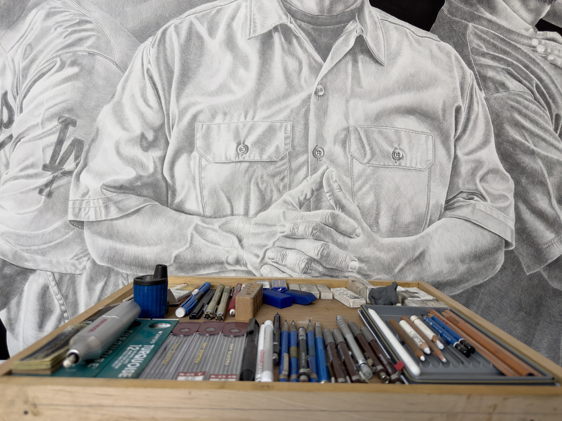 Title: A Man in Plain Sight Year: 2023 Medium: Graphite and acrylic on paper Dimensions: 42″ H × 60″ W Materials: Strathmore 500 Series Paper; Staedtler graphite pencils; Liquitex black acrylic gesso; Molotow One4All acrylic paint (black and white) Commissioning Body: LA County Department of Arts and Culture, Civic Art Division Unveiling: April 4, 2024 Status: Permanent collection, Los Angeles County Public Defender’s Office